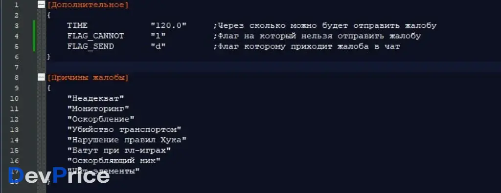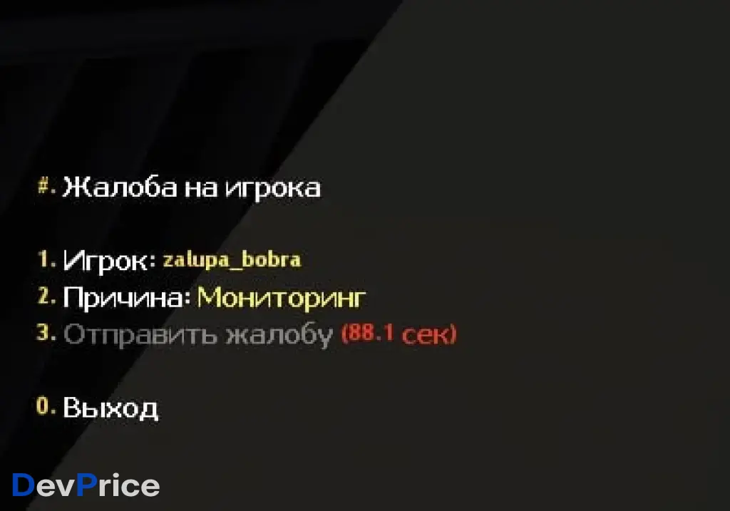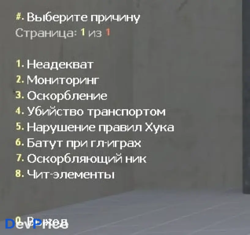 Система жалоб для игроков: выбор нарушителя и причины из конфига, отправка репорта администраторам с флагом. Поддержка задержки между жалобами, настраиваемые флаги и список причин.